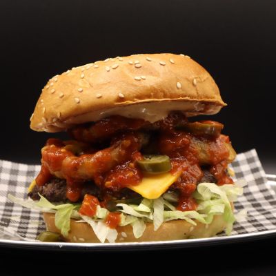 V2 patty, cheese, lettuce, onion, tomato salsa, jalapeños, hot sauce and mayo.