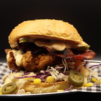 Buttermilk fried chicken, bacon, coleslaw, corn salsa, jalapeño, chipotle mayo and cheese sauce.