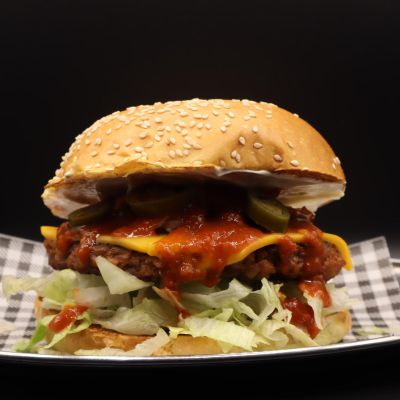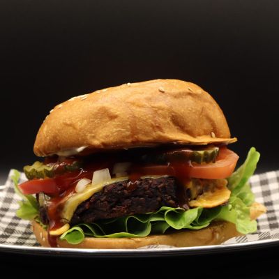 Beetroot and chickpea patty, cheese, lettuce, tomato, pickles, onion, mayo and BBQ sauce.