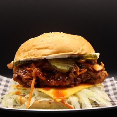 Buttermilk fried chicken, cheese, kimchi, pickles, onion, shredded lettuce and Korean sweet chilli gochujang glaze.