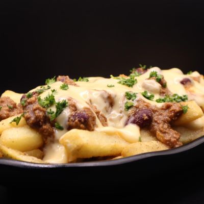 Chilli beef con carne, cheese sauce and fries.