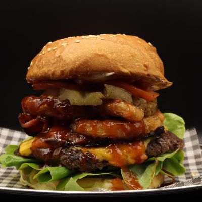 Beef, cheese, bacon, onion rings, grilled pineapple, lettuce, tomato, mayo and Gochujang glaze.